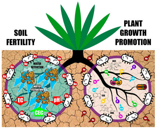 Effect of halotolerant PGPR bacteria on soil and the plant under high salinity. The exopolysaccharide produced by halobacteria plays a key role in Na+ sequestration and the consequent reduction in soil electrical conductivity (EC). Besides, it favors the formation of aggregates in soil, with macro and micropores that improve water filtration and retention. It also increases cation exchange capacity (CEC), decreases the pH and improves nutrient availability. Altogether, these contribute to increase soil fertility. On the other side, halobacteria solubilize nutrients, release osmolytes, antioxidant enzymes (SOD = Superoxide dismutase, CAT = Catalase, POD = Peroxidase), auxins (IAA = Indol acetic-acid), gibberellins (AG3 = Gibberellic acid), stress signaling and adaptation molecules (ABA = Abscisic acid) that favor plant growth and protection against salinity, and improve water retention and Na+ extrusion thanks to the exopolysaccharide.