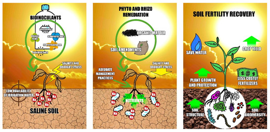 Arid and semi-arid zones are the areas most affected by drought and salinity, two types of abiotic stress closely related to each other. Salinization is the increase in the concentration of soluble ions such as Na+, Ca2+, Mg2+ and K+ as a result of low precipitation and high temperatures. Agricultural activities promote the salinization of soils through irrigation with poor-quality water, inadequate farming systems and excess use of conventional mineral fertilizers and pesticides [4,5], all of which ultimately reduce soil fertility and quality.