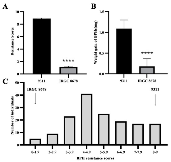 Figure 1. Genetic analysis of brown planthopper (BPH) resistance in IRGC 8678. (A) BPH resistance scores of 9311 and IRGC 8678; (B) weight gains of BPHs fed on 9311 and IRGC 8678 for 48 h. All data are means ± the standard error of the mean (SEM). **** indicates a significant difference at p < 0.0001 by t-test; (C) frequency distributions of the BPH resistance scores in the F2 population derived from 9311 × IRGC 8678.
