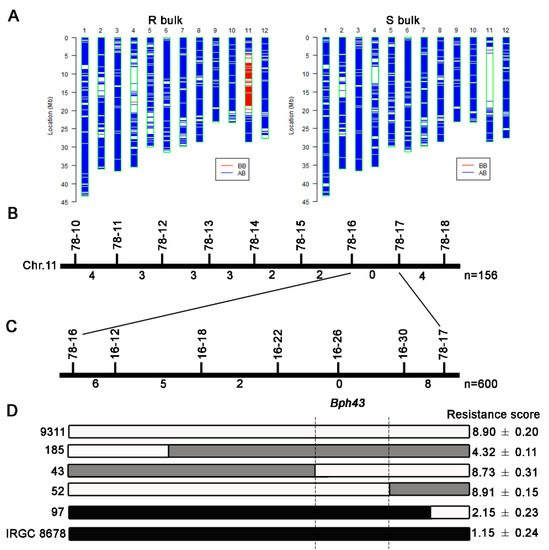 Figure 2. Molecular mapping of Bph43. (A) Mapping of Bph43 on rice chromosome 11 using bulked segregant analysis (BSA)-based rice chip GSR 40K analysis. Red lines indicate the genetic background of IRGC 8678, while white ones indicate that of 9311. Blue lines indicate the heterozygous genomic fragments between IRGC 8678 and 9311. R, resistant; S, susceptible; (B) mapping of Bph43 on the genomic region flanked by markers 78–16 and 78–17; (C) physical map of marker intervals 78–16 and 78–17. The numbers below the line in (A,B) indicate the numbers of recombinants between adjacent markers; (D) graphical genotypes and resistance phenotypes of the recombinants. The black, white, and grey bars denote the genotypes of IRGC 8678 homozygotes, 9311 homozygotes, and heterozygotes, respectively.