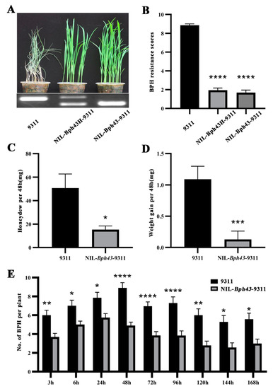 Figure 3. Characterization of BPH resistance of NIL-Bph43-9311: (A) seedling resistance tests of heterozygous and homozygous NIL-Bph43-9311 plants. The PCR band patterns amplified with insertion-deletion (InDel) markers 16–26 showed that NIL-Bph43-9311 was homozygous for Bph43 and heterozygous for NIL-Bph43H-9311 and 9311 contained no Bph43; (B) BPH-resistance scores of 9311, NIL-Bph43H-9311, and NIL-Bph43-9311; (C) honeydew excretion; and (D) weight gains of BPH feeding on NIL-Bph43-9311 and 9311 for 2 days; (E) numbers of BPH insects settled on NIL-Bph43-9311 and 9311 in the two-host choice test. Data represent means ± SEM of 20 replicates. The asterisks indicate significant differences (*, p < 0.05; **, p < 0.01; ***, p < 0.001; ****, p < 0.0001; Student’s t-test).