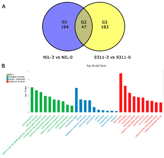 Figure 4. Gene ontology (GO) annotation of upregulated differentially expressed genes (DEGs): (A) Venn analysis of upregulated DEGs between NIL-Bph43-9311 and 9311; (B) top 30 GO terms of specific upregulated DEGs in NIL-Bph43-9311. 9311-0 and 9311-3 refer to 9311 sampled at 0 and 3 h of BPH infestation, respectively, and NIL-0 and NIL-3 refer to NIL-Bph43-9311 plants sampled at 0 and 3 h of BPH infestation, respectively.