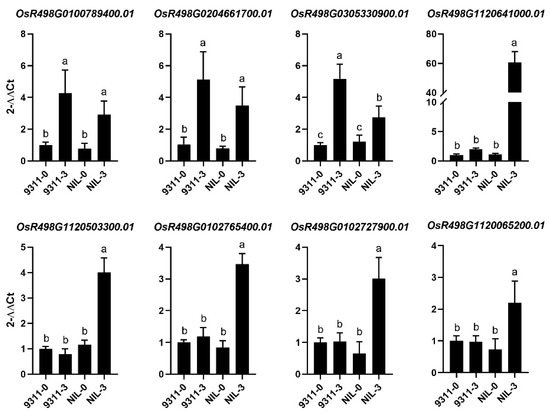 Figure 5. Quantitative real-time PCR (qRT-PCR) validation of the selected DEGs in 9311 and NIL-Bph43-9311. OsAct1 was used as an internal control. The relative expression levels of each gene were measured using the 2−ΔΔCT method. Data represent the means (three biologically independent experiments for gene expression) ± SEM. Different letters above the bars indicate significant differences (p < 0.05).