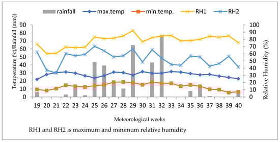 A research trial was studied at Agronomy Farm, SKUAST-K, Wadora-Sopore, J&K, in the 2 consecutive kharif seasons (2017 and 2018). Wadora is situated at 34°34′ North latitude, 74°40′ East longitude, and at 1587 m altitude from mean sea level. In the mid-latitude temperate zone, the research farm has 812 mm mean annual precipitation. During the experimental years, the total rainfall of 339.4 and 352.5 mm was received in 2017 and 2018, respectively, with minimum temperatures fluctuating from 5.25 to 19.30 °C and 5.41 to 18.6 °C. Maximum temperatures fluctuated from 24.5 to 32.7 °C and 22.0 to 31.8 °C, respectively (Figure 1 and Figure 2), and mean relative humidity (R.H) ranged from 67.3 to 90.8% and 60.1 to 92.1% (maximum R.H) and 32.1 to 64.4 percent and 33.3 to 70.4 percent (minimum R.H), respectively. This location has a cold temperate climate, with minus winter temperatures and moderate temperatures in the summer. The rice crop in this area has a growth period of 140–150 days. Samples from the top 20 cm of the soil profile were taken to assess initial nutrients. The texture of soil was silty-clay-loam, with a neutral pH and medium range of organic carbon (O.C), medium in available nitrogen (N), phosphorus (P) and potassium (K) (Table 1).
