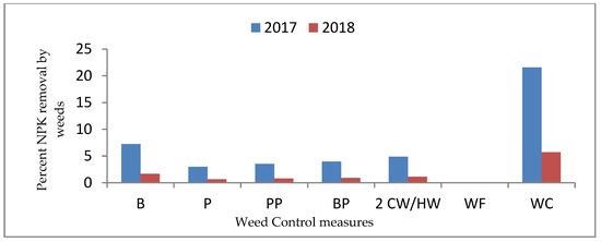 Weeds also compete for nutrients and recorded significant uptake of total nitrogen, phosphorus and potassium under various establishment techniques and weed control practices. Maximum uptake by weeds under different crop establishment treatments was observed under DSR (29.74 and 7.14 kg ha−1), then was followed by SRI (11.43 and 2.63 kg ha−1) and TPR (9.26 and 2.09 kg ha−1). Under different weed control measures, the maximum NPK total uptake was noticed in WC treatment by weeds (Table 9). Percent of nutrients removed via weeds indicated that significantly more significant amounts of nitrogen, phosphorus, and potassium were removed during the study period. The maximum contribution of 10.68 and 2.66% by weeds was noticed under DSR among different establishment techniques (Figure 3; Table 9). However, under various weed management measures, a weedy check showed a maximum contribution of 21.55 and 5.71% towards removing nutrients by weeds during our research (Figure 4).