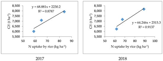 Linear regression line among weed management practices between N uptake vs. Grain yield (GY).