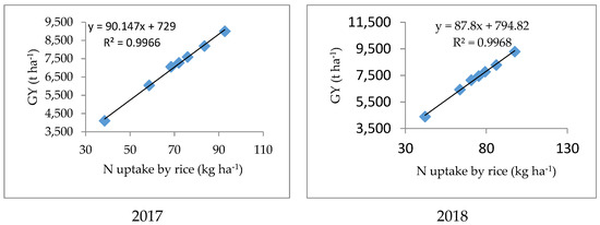 Linear regression line among crop establishment methods between N uptake vs. Grain yield (GY).
