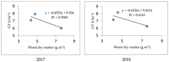 Linear regression line among weed management practices between weed dry matter vs. Grain yield (GY).