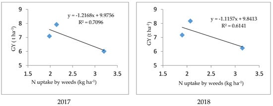Linear regression line among weed control measures between N-uptake by weeds vs. Grain yield (GY).