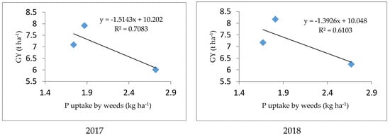 Linear regression line among weed control measures between P-uptake by weeds vs. Grain yield (GY).