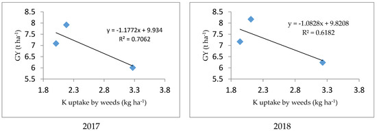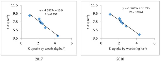 Linear regression line among weed control measures between K-uptake by weeds vs. Grain yield (GY).