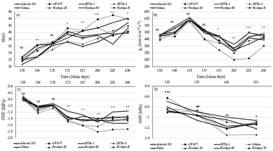 Seasonal patterns of leaf chlorophyll content (SPAD) (A), stomatal conductance (B) and tree water status (C) for ‘Vairo’ almond cultivar and the seasonal patterns of tree water status (D) for ‘Big Top’ nectarine cultivar grafted onto eight different Prunus rootstocks. Ns = not significant; * p ≤ 0.05; ** p ≤ 0.01; *** p ≤ 0.001.