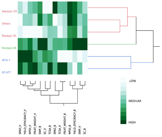 Taking the values for the last day of the evaluation for all the physiological assessments together and combining them with those for the most relevant agronomical assessments at harvest (vigor, fruit weight, and yield efficiency), for both ‘Vairo’ and ‘Big Top’ cultivars, the six common rootstocks were grouped within three clusters (Figure 4). The first cluster, which included Adesoto 101, Ishtara, and Rootpac-20, was characterized by mainly low-to-medium SPAD, ΦPSII, fruit weight, vigor, and SC values, and medium-level SWP values for the ‘Vairo’ almond cultivar, and medium-to-high ΦPSII values, and medium-level fruit weight and SC values for ‘Big Top’ nectarine cultivar. Rootpac-40 clustered alone, since it had the highest SWP and SC values on both cultivars, and the highest yield efficiency for ‘Big Top’ nectarine cultivar. For the rest of the traits considered in this dendrogram, Rootpac-40 exhibited medium-to-high values on both cultivars. The last group was comprised by IRTA-1 and GF-677. Both rootstocks had high SPAD, ΦPSII and yield efficiency values, and medium-level SC values for ‘Vairo’ almond cultivar, and medium-level SWP and SPAD values, and low yield efficiency and SC values for ‘Big Top’ nectarine cultivar.