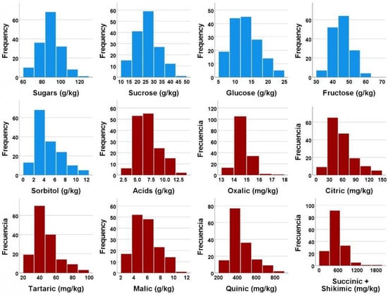 The quantitative profiles of the individual sugars and organic acids for the 155 apple accessions for the mean of the five years of study are shown in Figure 1. Firstly, it is easily noticed the great variability found in this study for all the traits assessed. Moreover, for most of the variables, the data set could be well modelled by a normal distribution and thus seemed to be normally distributed. In general, the concentration of the organic acids was lower than the sugars amounts, even though malic acid had higher concentrations. According to the major sugar and the major organic acid, respectively, fructose reached 61.41 g kg−1 FW (‘Akane’), while normally it was between 40–50 g kg−1 FW, and malic acid reached the largest concentration in ‘Urarte’ (10.69 g kg−1 FW), although usually it was within the range 4–8 g kg−1 FW.