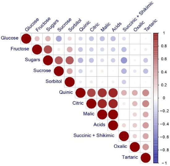 Pearson’s correlation coefficients for the traits studied for the 155 accessions assessed during the five years of study. Abbreviations: Sugars—total sugars; Acids—total organic acids. The size of the circle for each correlation and the colour depicts the significance and the magnitude of the correlation coefficient, respectively.