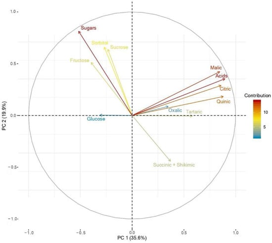 Two-dimensional principal component analysis (PCA) plot for all the 12 variables assessed. The colours showed the contributions of variables accounting for the total variability. Abbreviations: Sugars—total sugars; Acids—total organic acids.