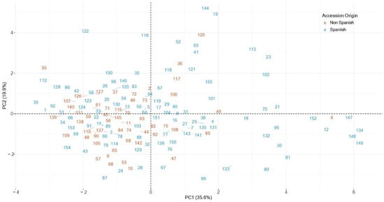 PC1 correlated mostly with total and individual organic acids (Figure 3 and Supplementary Table S6). Total acids and sugars were the two traits with more contribution in the two-dimensional principal component analysis. Malic, citric, and quinic acids had a great contribution in the total variance, while glucose and oxalic acid had a very low contribution in the two first PCs (Figure 3). Figure 4 showed the PCA plot for the 155 accessions included in this study for the 12 variables studied. Accessions with positive loading on PC1, mainly Spanish accessions (‘Bellaguarda Lardero—MSV 27’, ‘Santa Margarida’, ‘Transparente’, ‘Transparente Blanca’, ‘Urarte’, ‘Verde Doncella_MRF 36’) as well as the non-Spanish accession ‘Astrakan Red’ were characterized by higher values of organic acids and other biochemical compounds. On the contrary, accessions with negative loadings (including 44 out of 56 non-Spanish accessions such as ‘Fuji’, ‘Nueva Starking’, ‘Regal Prince_1’, ‘Galaxy’, ‘Redaphough’, ‘Starkrimson_1’, or ‘Evasni’) had lower values for these traits.