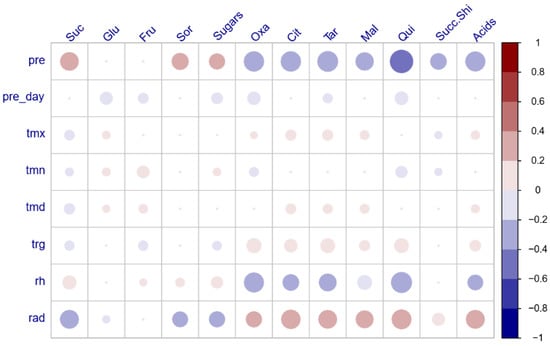 Correlations between the different sugars and organic acids of the 155 accessions studied and the climatic traits. Abbreviations: Suc—sucrose; Glu—glucose; Fru—fructose; Sor—sorbitol; Sugars—total sugars; Oxa—oxalic acid; Cit—citric acid; Tar—tartaric acid; Mal—malic acid; Qui—quinic acid; Succ + Shi—succinic + shikimic acid; Acids—total organic acid; pre—total precipitation; pre_day—mean daily precipitation; tmx—mean daily maximum temperature; tmn—mean daily minimum temperature; tmd—mean daily temperature; trg—mean daily temperature range; rh—relative humidity; rad—solar radiation. The size of the circle for each correlation and the colour depicts the significance and the magnitude of the correlation coefficient, respectively.