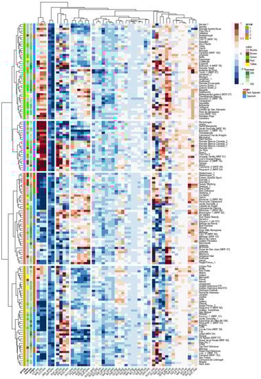 A two-way cluster analysis based on the Manhattan distance was used to hierarchically classify the 155 apple accessions and the independent variables according to the model coefficients (Figure 6). The Manhattan distance is the sum of the distances between the accessions and traits assessed. Groups of accessions would indicate similar mean concentrations of biochemical traits and similar climate influence, while clusters of variables would group together model coefficients that tend to behave similarly across the accessions.