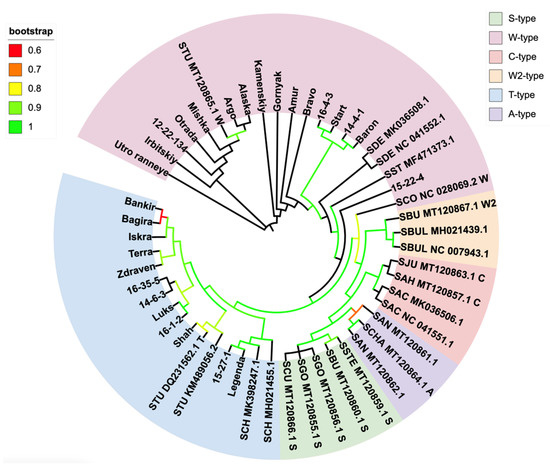 For phylogenetic identification and plastome classification, the resolution of nanopore sequencing is sufficient. Despite a higher error rate of ONT long-reads than Illumina short-reads [31], a wide range bacterial genome studies based only on ONT long-reads demonstrated the accuracy of ONT technology for the phylogenetic tree construction [32,33,34], and applicability for in situ surveillance protocols [35]. Even the variety Otrada, whose sequencing depth was only 50, showed 99.97% identity to MT120865 (S. tuberosum). Therefore, we used all de novo plastome assemblies for phylogenetic identification. Plastomes with a confirmed type were taken as reference-based sequences of the potato plastid genome [6]: W-type—Solanum tuberosum (MT120865) and S. commersonii (NC_028069); W2-type—S. bukasovii (MT120867); T-type—S. tuberosum (DQ231562); C-type—S. tuberosum ssp. andigenum (MT120861), S. ahanhuiri (MT120857) and S. juzepczukii (MT120863); A-type—S. chaucha (MT120864) and S. tuberosum ssp. andigenum (MT120862); S-type—S. curtilobum (MT120866), S. bukasovii (MT120860), S. stenotomum subsp. stenotomum (MT120859), and S. stenotomum subsp. goniocalyx (MT120855 и MT120856). Other known sequences were also added to the analysis: S. tuberosum (KM489056), S. chacoense (MH021455, MK398247), S. aucale (NC_041551, MK036506), S. demissium (NC_041552, MK036508), S. stoloniferum (MF471373), and S. bulbocastanum (NC_007943, MH021439). To avoid the false clades, we manually flipped SSC regions in those assembled genomes, where required, in accordance with the reference sequences.