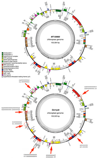 Annotated plastome sequences Solanum tuberosum (MT120865) and our variety Gornyak. Red arrows and dotted circles indicate the homopolymer regions in genes with indels. Next to the arrows, the sequences at the top, are related to MT120865, and those at the bottom are related to Gornyak.