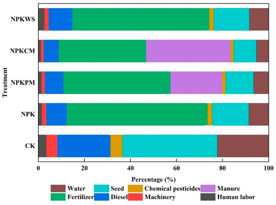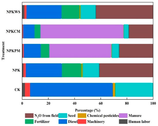 The emissions from human labor, machinery, diesel, fertilizer/manure, chemical pesticides and N2O from the field made up the total CO2−eq emission (Figure 4). Results showed that the CO2−eq emissions from fertilizer/manure contributed the highest CFs in NPKCM (66%) and NPKPM (54%), followed by N2O from the field (26% in NPKPM and 19% in NPKCM). Generally, such a high contribution of farmyard manure to the carbon footprint happens in organically fertilized farms, and is attributable to the substantial input of farmyard manure [32]. Nevertheless, other results reported that diesel fuel use was the main contributor to the carbon footprint, as used for crop management, such as more diesel fuel for irrigation in dryland (76%) wheat agroecosystems compared with irrigated (47%) wheat agroecosystems [52]. Notably, under CK in this study, diesel (63%) was also the biggest CO2−eq emissions contributor. Furthermore, the composition of CO2−eq emissions for NPKWS, in which N2O from the field contributed 44%, followed by diesel with 27% of the total CO2−eq emission on average. It was also confirmed by Lal et al. [43] that N2O from field emission accounts for the largest proportion.