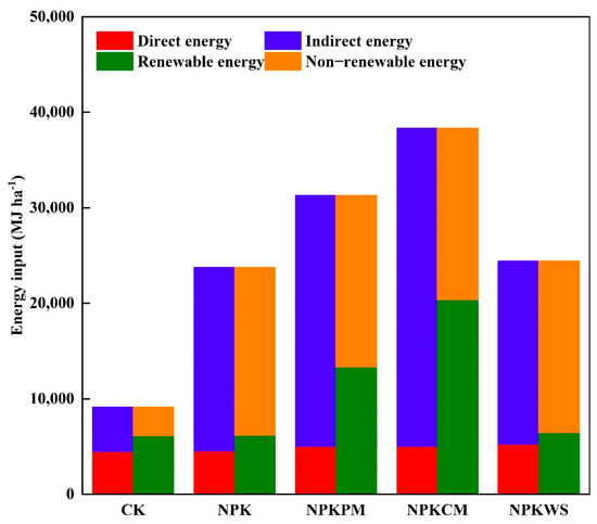 The indirect energy consumption was higher than direct energy in all treatments (Figure 3). The contribution of indirect energy input to total energy inputs was highest in NPKCM (87%) and lowest in CK (51%). In accordance with previous studies [42,44], the contribution of renewable energy to total energy input was lower than non−renewable energy in NPK, NPKPM and NPKWS. The share of renewable energy was much higher than non−renewable energy in CK, which was due to the lack of chemical fertilizer application. The present results further indicated that wheat production was mainly based on non−renewable energy. However, it was found that the share of renewable energy in NPKCM and NPKPM were higher than that in NPK and NPKWS, which suggested that the application of farmyard manure can effectively reduce the contribution of non−renewable energy in wheat production [31].