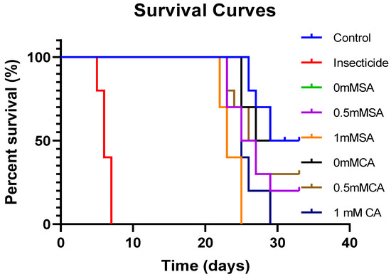 Total B. brassicae progeny, progeny per adult, and progeny nymph survival were also affected by SA and CA treatments, with statistically significant differences from the control observed for total progeny (F6, 63 = 14.79, p < 0.0001), progeny per adult (F6, 63 = 57.9, p < 0.0001), and progeny nymph survival (p < 0.0001 and Kruskal–Wallis statistic = 60.891). Total progeny production was reduced significantly in the 1 mM SA treatment (43%), followed by 1 mM CA (32%), 0.5 mM CA (23%), and 0.5 mM SA (22%), compared to the control treatments (Figure 2g). Additionally, progeny nymph survival was significantly decreased under the 1 mM SA treatment (74%), followed by 1 mM CA (63%), 0.5 mM SA (52%), and 0.5 mM CA (42%), compared against the control treatments (Figure 2h). Percent progeny nymph survival decreased significantly by 55% in the 1 mM SA treatment, 47% in 1 mM CA, 39% in 0.5 mM SA, and 26.23% in 0.5 mM CA, compared with the control (Figure 2i). Similarly, percent nymph mortality increased to 55% in the 1 mM SA treatment, followed by 47% in 1 mM CA, 40% in 0.5 mM SA, and 27% in 0.05 mM CA, compared to 3% in the control (as the percentage mortality mathematically is 100%—percentage survival) treatments (Mantel-Cox test: χ2 = 137.9, df = 7, p < 0.0001). Insecticide treatment killed all B. brassicae aphids within 5–7 days of application (Figure 1). Decreases in survival were greatest at the highest rates of SA and CA treatments.