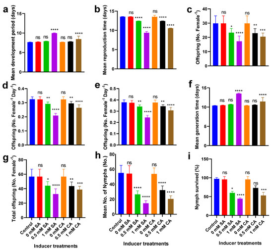 Effects of SA (Salicylic Acid) and CA (Citric Acid) on different fitness attributes of Brevicoryne brassicae (Mean ± SD, n = 10). (a) Development period (Days). (b) Reproduction time (Days). (c) Effective fecundity (No. Female Day−1). (d) Intrinsic rate of natural increase (No. Female−1 Day−1). (e) Relative growth rate (No. Female−1 Day−1). (f) Generation time (Days). (g) Total progeny production (No. Female−1). (h) Immature becoming adults (No Female.). (i) Progeny nymph survival (%). Statistical significance of P in post hoc tests: ns ≥ 0.05, * <0.05, ** <0.01, *** <0.001, **** <0.0001.