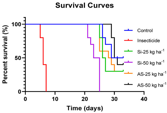 The Si and AS treatments had significantly different Kaplan–Meier survival functions from the control (Mantel–Cox test: χ2 = 102.9, df = 5, p < 0.0001). Insecticide application killed all B. brassicae within 7 days of application; conversely, the 50 kg/ha dose of SI did not produce B. brassicae mortality until day 26. At day 33, 30% of aphids remained alive at the 50 kg/ha dose of AS. The moderate doses of both nutrients (25 kg/ha) were least effective and 30% of aphids still survived until the end of testing in these treatments (Figure 3).