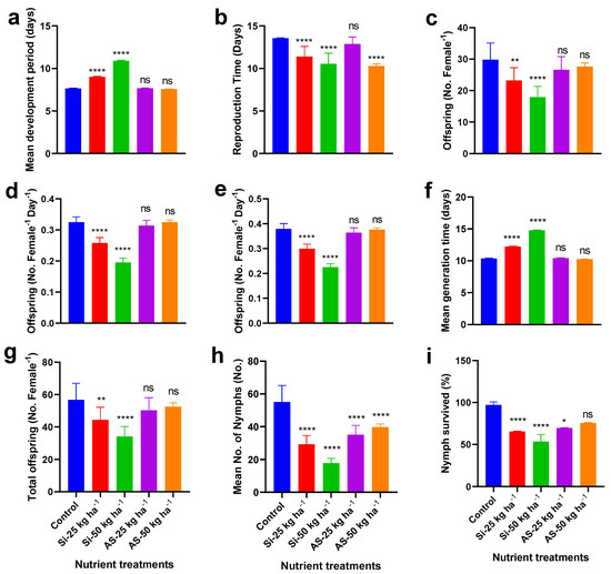 Effects of Si (Silicon) and AS (Ammonium Sulfate) on different fitness attributes of Brevicoryne brassicae compared to the control (Mean ± SD, n = 10). (a) Development period (Days). (b) Reproduction time (Days). (c) Effective fecundity (No. Female−1). (d) Intrinsic rate of natural increase (No. Female−1 Day−1). (e) Relative growth rate (No. Female−1 Day−1). (f) Generation time (Days). (g) Total progeny production (No. Female−1). (h) Progeny nymphs surviving to adulthoods (No. Female). (i) Percent progeny nymph survival (%). Statistical significance of P in post hoc tests: ns ≥ 0.05, * <0.05, ** <0.01 **** <0.0001.