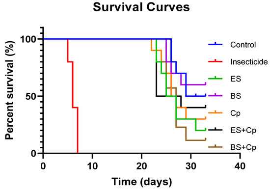 The Kaplan–Meier survival functions showed statistically significant differences among SAM treatments (Mantel-Cox test: χ2 = 99.29, df = 6, p < 0.0001). In the insecticide treatment, no B. brassicae aphids survived and all died within 7 days of application. Conversely, 20% and 50% aphids survived in ES and BS treatments, respectively, until day 33, the last day of observation. The Cp treatments resulted in 30% survival until day 33. About 40% survived until day 33 in the ES + Cp treatment. In the BS + Cp treatment only 10% remained alive until the last day, and aphid survival was 30% in the control treatment (Figure 5).