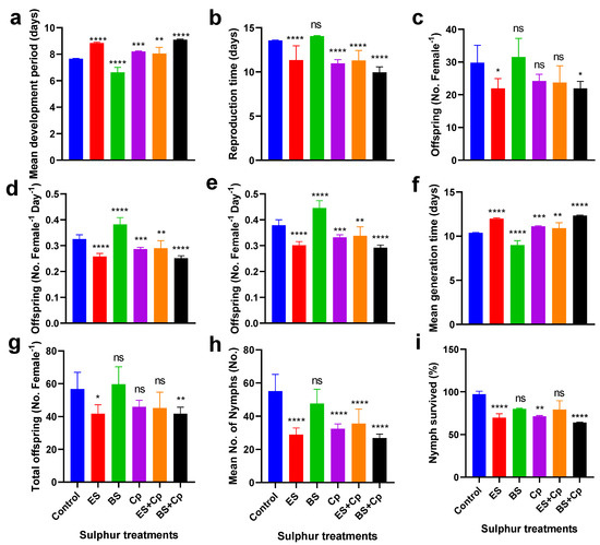 Effects of soil amendment treatments, ES (Elemental Sulfur), BS (Bio-Sulfur), and Cp (Compost) on different fitness attributes of Brevicoryne brassicae (Mean ± SD, n = 10). (a) Development period (Days). (b) Reproduction time (Days). (c) Effective fecundity (No. Female−1). (d) Intrinsic rate of natural increase (No. Female−1 Day−1). (e) Relative growth rate (No. Female−1 Day−1). (f) Generation time (Days). (g) Total progeny production (No. Female−1). (h) Progeny nymphs reaching adulthood (No. Female). (i) Progeny nymph survival (%). Statistical significance of p in post hoc tests: ns ≥ 0.05, * <0.05, ** <0.01, *** <0.001, **** <0.0001.