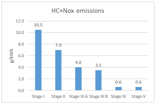 Based on these emissions data defined by the European directives and assuming an average power of agricultural vehicles of 90 kW and about 400 working hours per year [36], the annual impact of the emissions of a tractor was calculated according to the emissions standard to which it complies (see Table 4).