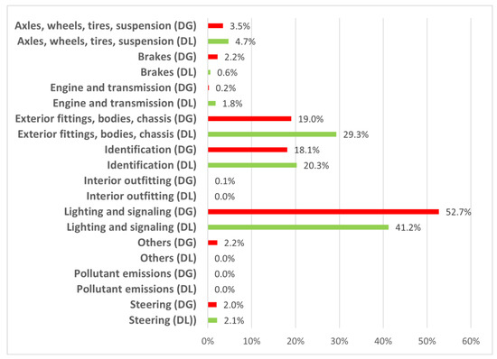 A disaggregation of the rejections by type of defect (see Figure 2) shows that more than half of them (52.7%) were related to lighting and signaling, followed by defects in interior fittings, bodywork, and chassis (19.0%) and identification (18%).