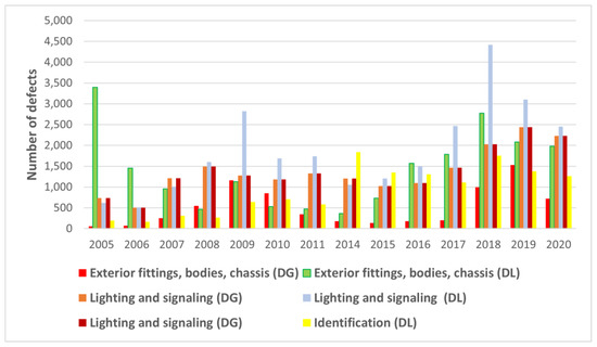 Number of serious (DG) and minor (DL) defects in lighting and signaling, identification and exterior fitting, bodywork, and chassis per year.
