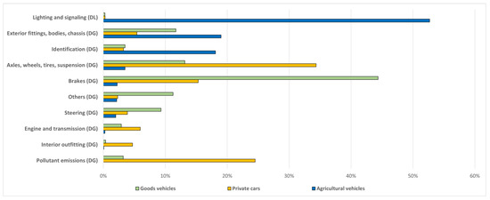 Figure 4 shows that unlike agricultural vehicles, where most of the serious defects were found in the categories of lighting and signaling; exterior fittings, bodywork, and chassis; and identification, in other types of vehicles, almost no serious defects were detected in lighting and signaling, very few in identification, and defects in exterior fittings, bodywork, and chassis also had a lower rate.