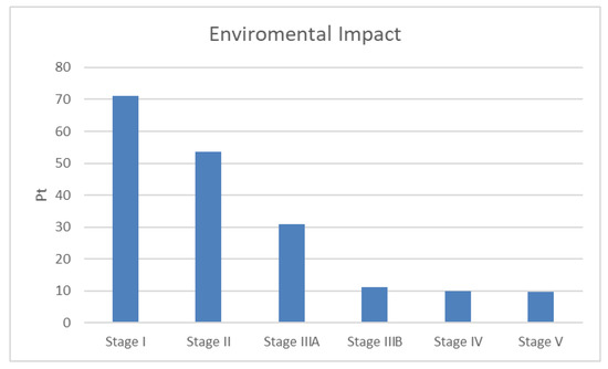 The reduction of the environmental impact is clearly noticeable in phases I, II, and IIIA and IIIB, with reductions of 24.41%, 42.36%, and 63.85%, respectively. The following developments resulted in a smaller reduction, with variations of 12.11% and 0.19%.