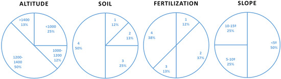 The characteristics of the meadows varied between 902 and 1615 m of altitude, between 1 and 4 in the soil category, between 1 and 15° in slope, and between 1 and 4 in the fertilization type (Figure 2).