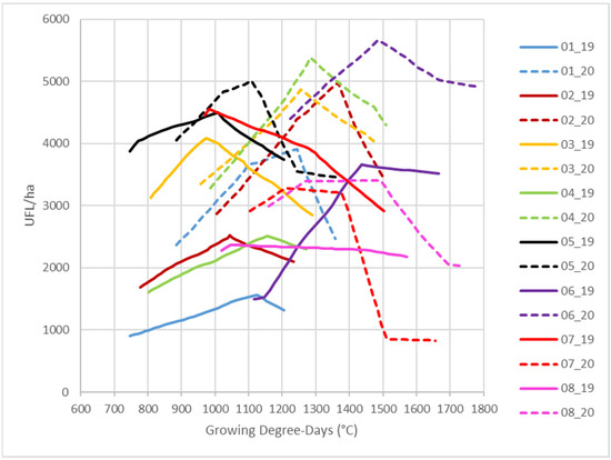 Relationship between UFL ha−1 and growing degree days of the eight meadows in the two years from 20 May to 24 June.