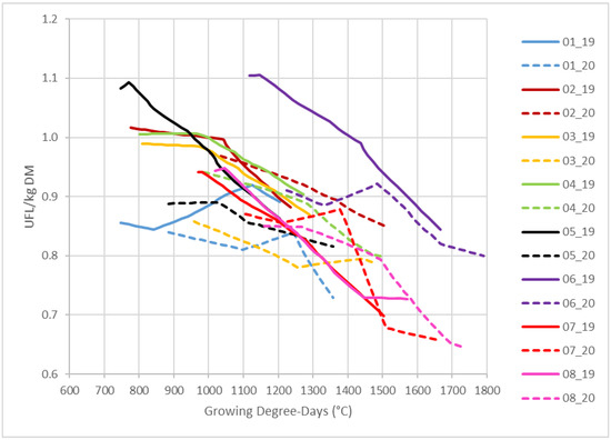 Relationship between UFL kg DM−1 and growing degree days of the eight meadows in the two years from 20 May to 24 June.