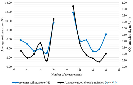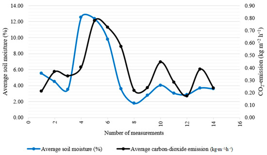Soil moisture (%) and carbon-dioxide-emission (kg m−2·h−1) results for the 2020 study period, independent of treatments (Karcag).