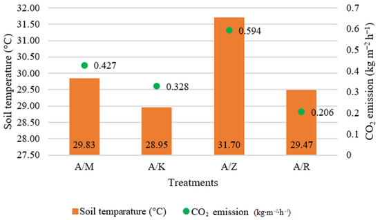 Average results of soil temperature (°C), CO2-emission (kg·m−2·h−1) by treatment on 28 July 2020 (Karcag). Note: A/Z: Unused/abandonment grassland treatment; A/M: mulch treatment; A/K: Mowing treatment; A/R: Grassland.