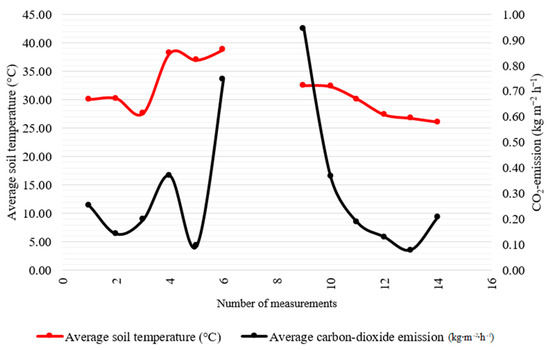 Soil temperature (°C) and carbon-dioxide-emission (kg·m−2·h−1) results for the 2019 study period, independent of treatments (Karcag).