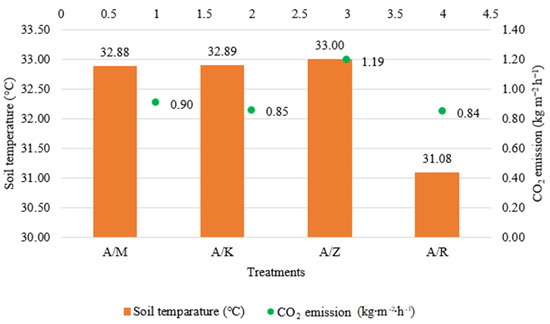 In our 2019 study, the highest values of carbon dioxide emissions for all treatments were obtained between 23 May and 6 June (Figure 2 and Figure 3). Trends in soil temperature, soil moisture, and carbon dioxide emission for the year were plotted independently of the treatments.