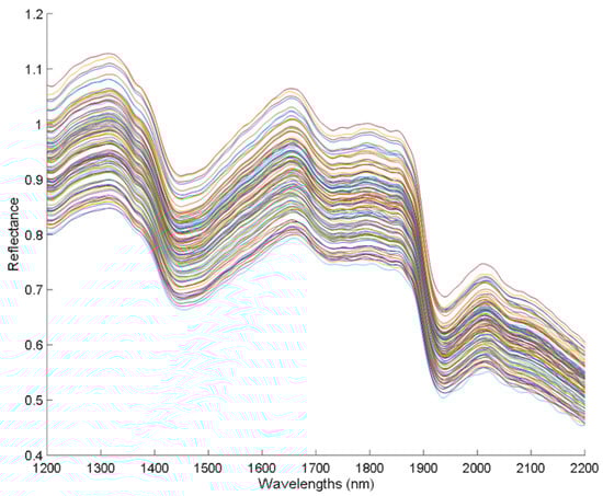 Spectra were collected using an Acousto-Optic Tunable Filter (AOTF) NIR and Indium Gallium Arsenide (InGaAs) detector, called a Luminar 5030 Miniature “Hand-held”, in the reflectance mode and equipped with Snap32!™ software (Brimrose Corporation of America, Sparks, MD, USA). A spectral range of 1200–2200 nm was used to obtain the spectra, with a sampling interval of 2 nm, and scanning speed of 60 ms. Each spectrum recorded by the instrument was the average of 50 scans.