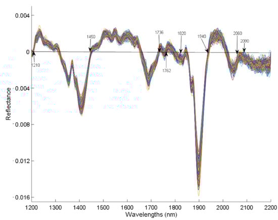 Figure 3 shows the reflectance spectra of the samples after applying the first derivative based on the Savitzky–Golay algorithm. The typical absorption bands of plant material appear in the NIR region derived from the superpositions corresponding mainly to overtones and to the combination of vibration modes that involve chemical bonds of the types C-H, O-H, and N-H []. In NIR reflectance spectra, the absorption bands of the molecules that make up the sample are described as valleys rather than peaks, since the absorbance equals Log (1/Reflectance). The hemp spectra obtained in this study show the characteristic bands around 1210, 1450, 1736, 1762, 1820, 1940, 2060, and 2090 nm that are characteristic of proteins, lipids, water, and other compounds present in hemp in the main absorptions (of OH, NH, CH, and other bonds).