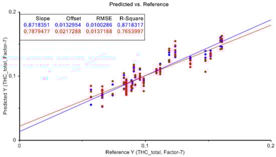 Similarly, the RPD was considered a good indicator of the predictive capacity. In the prediction of total THC content, RPD values > 2 were obtained, which indicates the goodness of the models. The higher the RPD value, the greater the ability of the calibration model to accurately predict the reference parameter values (Table 2).