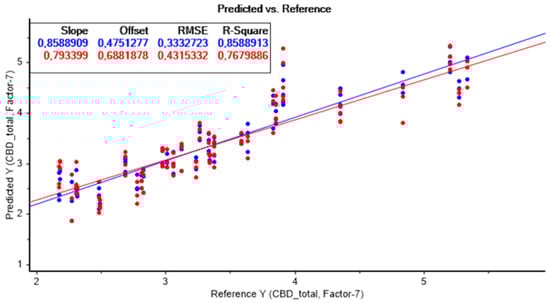 The best model to predict CBD content was also obtained without applying any data pretreatment technique. A high R2c value of 0.86, R2cv of 0.77, and an RPD > 2 were achieved, indicating the predictive capacity of the model. The lower RMSECV values of 0.431 were also considered.