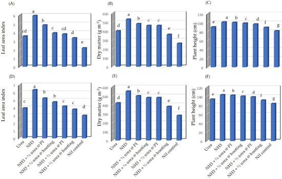 Rice growth characteristics as affected by different N treatments, described in Table 1. Leaf area index: (A,D); Dry matter (g m−2): (B,E); and plant height (cm): (C,F) for the seasons 2017 and 2018, respectively. Values followed by different letters (a, b, c, d, e, f, g) are significantly different according to Duncan’s significant difference P < 0.05.